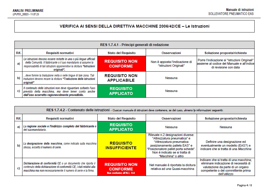Possiamo realizzare una accurata analisi della documentazione tecnica del Cliente (Manuale di istruzioni, Dichiarazione CE di conformità) in modo da far emergere lacune grafico-redazionali e normative che potrebbero compromettere la validità della documentazione. Questa evenienza è assolutamente negativa ai fini difensivi in caso di procedimenti giudiziari a seguito di infortuni o di verifiche ispettive degli organi di vigilanza.